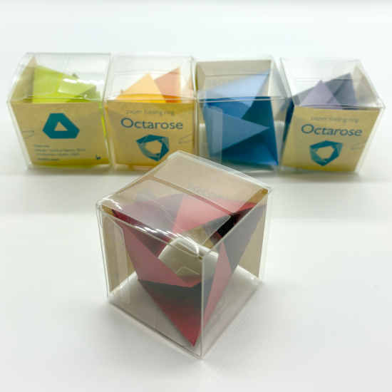paper folding ring. 1枚の紙から、立体のバラを作るパズルです。 ※紙の色は数種類ありますが こちらでランダムに選ばせていただきます 素材: 紙 package size: 42*42*42mm designed / Kohfuh Satoh, 2014, 2019 production / Kofth, 2025 Kofth